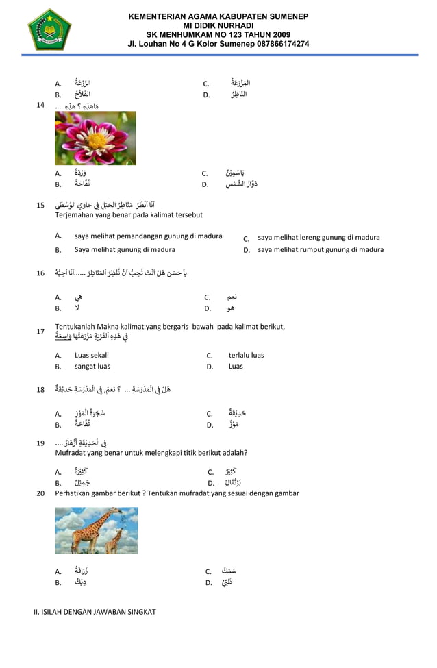 - Contoh Soal Identifikasi Gambar: Siswa dihadapkan pada sebuah gambar (misalnya, gambar kucing) dan diminta untuk memilih kata Bahasa Arab yang tepat untuk gambar tersebut dari beberapa pilihan. Soal seperti ini secara langsung menguji penguasaan kosakata visual siswa.